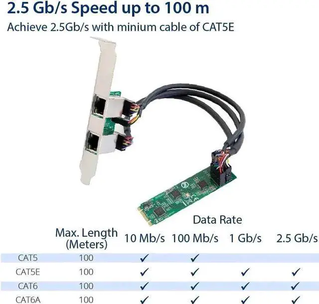 10/100/1000/25000 2.5 Gigabit Ethernet Network Adapter Card provides a simple connection to a 2.5 Gigabit Ethernet network, and is fully compatible with 802.1Q Virtual LAN (VLAN) Tag. and Ethernet card which is compliant to IEEE 802.3, IEEE 802.3 u and IEEE 802.3 ab.