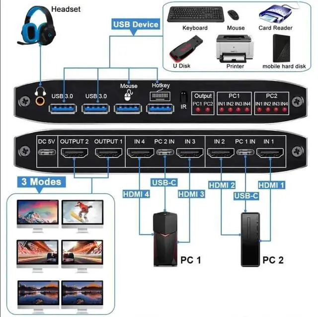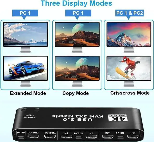 4K HDMI USB KVM Matrix allows you to share one USB keyboard, USB mouse, and two HDMI monitor to control 2 computers, laptops, game consoles.