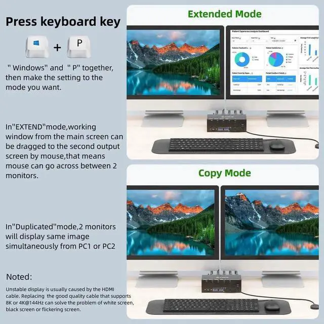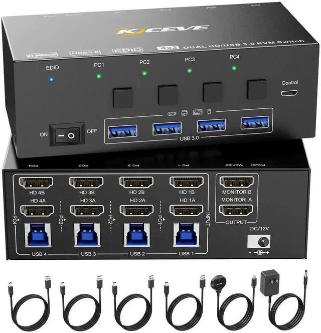 This 2 monitors 4 computers KVM switch with EDID emulators in each input port, keep computers always having correct display information when switch back.