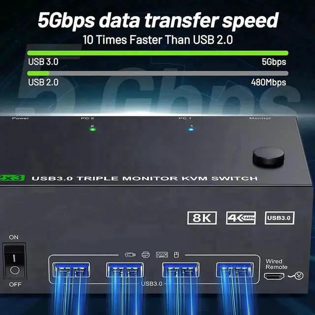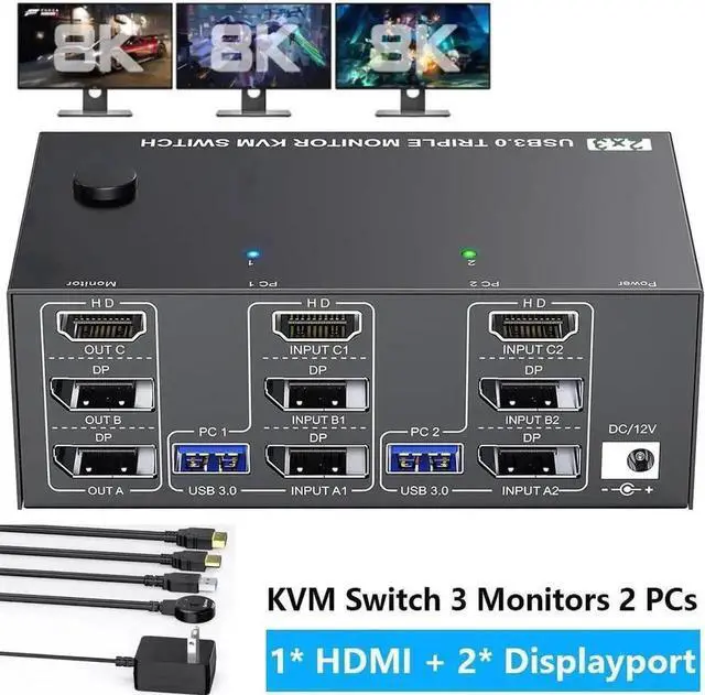 This 3 Monitors KVM Switch perfect for hooking up 2 computers to share 4 USB 3.0 ports and 3 monitors (supports extended and mirrored display modes).