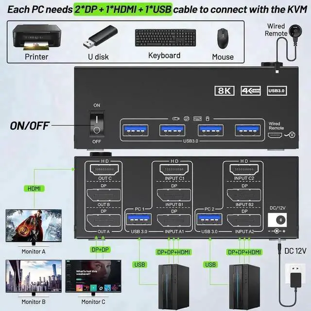 Each PC must have 1*HDMI+2*Displayport +1* USB cable to connect the 3 monitor KVM switch, OUT A, OUT B, OUT C connect to 3 monitors.