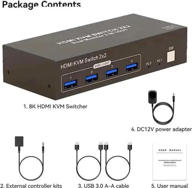 8K60Hz Dual Monitor HDMI USB 3.0 KVM Switch 2 computers share 2 monitors and 4 USB 3.0 device