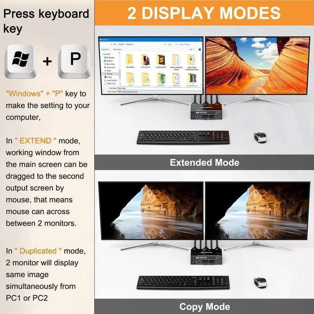 This Dual Monitor HDMI KVM switch can control 2 computers to share 2 monitors by 1 set of USB keyboard & mouse. When in copy mode the main screen can be copied to the secondary screen. When in extend mode, the window from main screen can be dragged to second screen.
