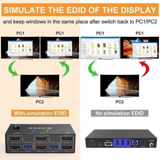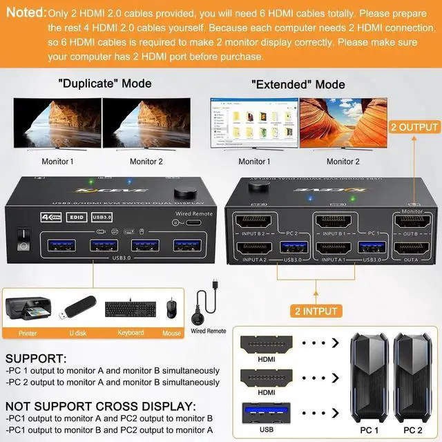 - [Ultra HD 4k Visual Enjoyment]This dual monitor switch can support resolution up to 3840x2160@60Hz, downward compatible with lower resolutions. Thanks for purchasing our USB 3.0 KVM switch, we provide one year guarantee, please feel free to contact with us if you need techical support help during use.