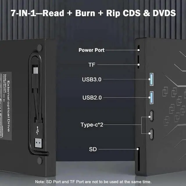 Our DVD player for laptop not only functions as a CD DVD burner/reader but also serves as a 7 in 1 USB hub for your laptop. External DVD drive for laptop includes 1 USB 3.0 port, 1 USB 2.0 port, 2 Type-C ports, 1 TF slot, and 1 SD card slot. This CD drive external USB versatile hub is compatible with various USB devices such as USB hard drives, wireless mice & keyboards, computer radiators, and other USB computer accessories. The SD and TF card slots are perfect for transferring photo and video files from your camera to your computer.