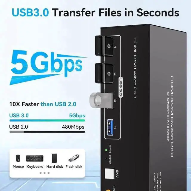 • [High Speed USB 3.0] This is a KVM Switch for 2 computers featuring 4 USB 3.0 ports. Each port can transmit data at speeds of up to 5Gbps, offering significantly faster performance compared to USB 2.0. USB 3.0 is also compatible with USB versions like 2.0/1.1