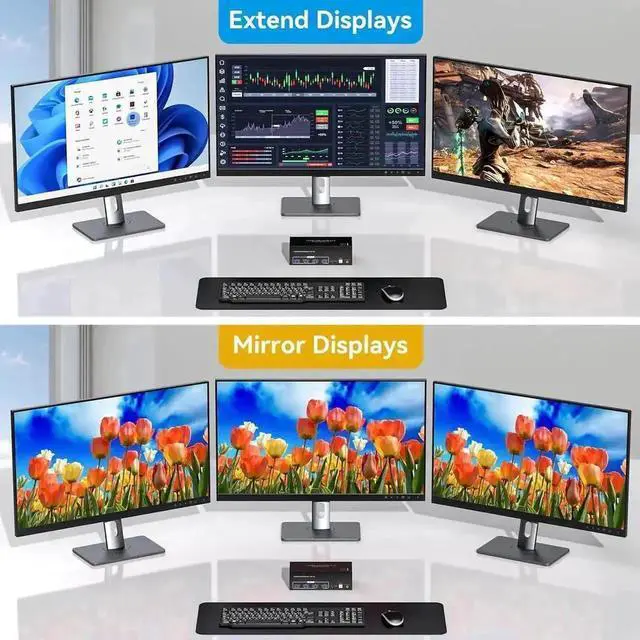 2. Triple monitors output support up to 8K@60Hz for extended and mirror display, support HDMI 2.1 and HDCP 2.3 standards.