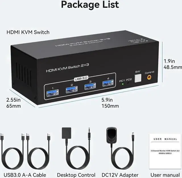 8K 60Hz 2x3 HDMI USB 3.0 KVM Switch allows you to share one USB keyboard, USB mouse, and three HDMI monotor to control 2 computers, laptops, game consoles.