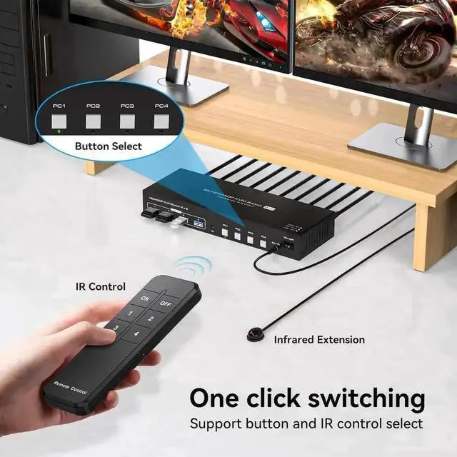 This dual monitor 4 IN 2 OUT DP+HDMI KVM Switch is for you to control them using one set of keyboard, mouse and single or dual monitors to make your work space tidy and efficient, also a premium choice for working from home. Only when your computer supports dual display or multi display, you can use this KVM to achieve 4 PC to share 2 monitors