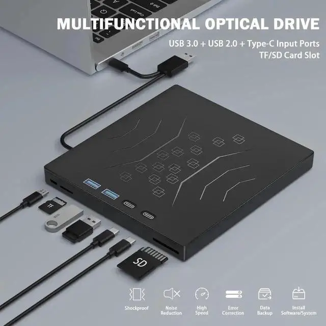 With many laptops lacking built-in CD/DVD drives, the inability to directly insert CDs or DVDs for tasks such as listening to music, watching movies, data backup, or system installations can be frustrating. We recently released an external CD drive provides an excellent solution to this problem. External CD/DVD drive for PC requires no additional drivers and is a plug-and-play device. This external DVD player for laptop boasts high error correction, anti-skid, and quiet capabilities.