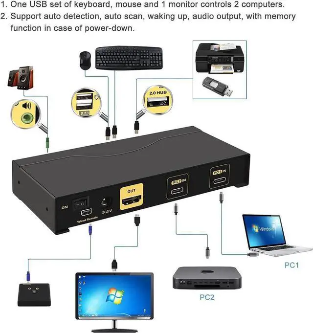 • 1. USB C Switch: 2 USB-C input, 1 HDMI output. 2 computers / PCs / Mac / laptops / mobile phones sharing one set of USB keyboard, mouse, 1 monitor and USB 2.0 peripheral. With 3.5mm stereo audio output.