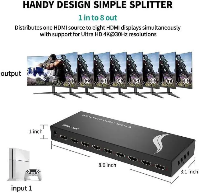 MT-VIKI SP108, HDMI splitter 1 in 8 out distributes 1 Hdmi input signal to 8 identical Hdmi output signals, transmit video and audio simultaneously without any quality loss.