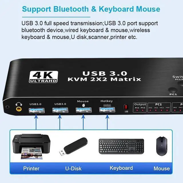 [Dual HDMI KVM Switch with USB 3.0 Port]- Supports Connecting your USB 3.0 port device such as Scanner/USB driver/3D Printer/Monitor Camera