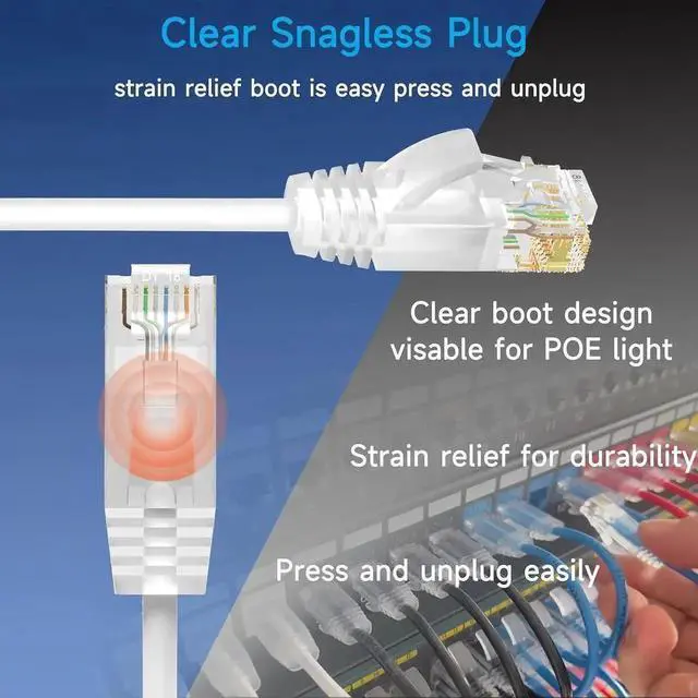 • Network patch cables are made of clear tap Snagless plug with strain relief boot for maximum durability. Cat6 patch cords with snagless plug is easy press and unplug. Clear boot of slim cat6 patch cable allows to see the light of the POE ports easily.