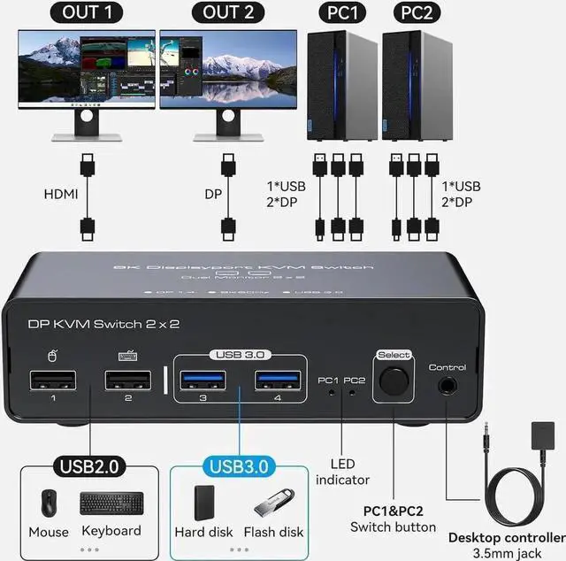The 2 port displayport kvm switch dual monitor allow you to control 2 computers with one set of keyboard and mouse and share 2 monitors and 4 USB devices. Extended mode outputs two different screens, while mirrored mode outputs two identical screens. Whether you're at home or in the office, displayport kvm switch is a great way to increase your productivity.