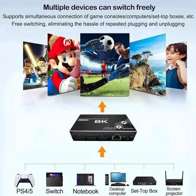 4K@120Hz HD display: This usb 3.0 kvm switch 2 port supports resolution up to 4K@120Hz and backward compatible. Kvm switch also support HDMI 2.0 and RJ45 Internet connection. Make your image display more delicate and lifelike, and your experience richer and more convenient.