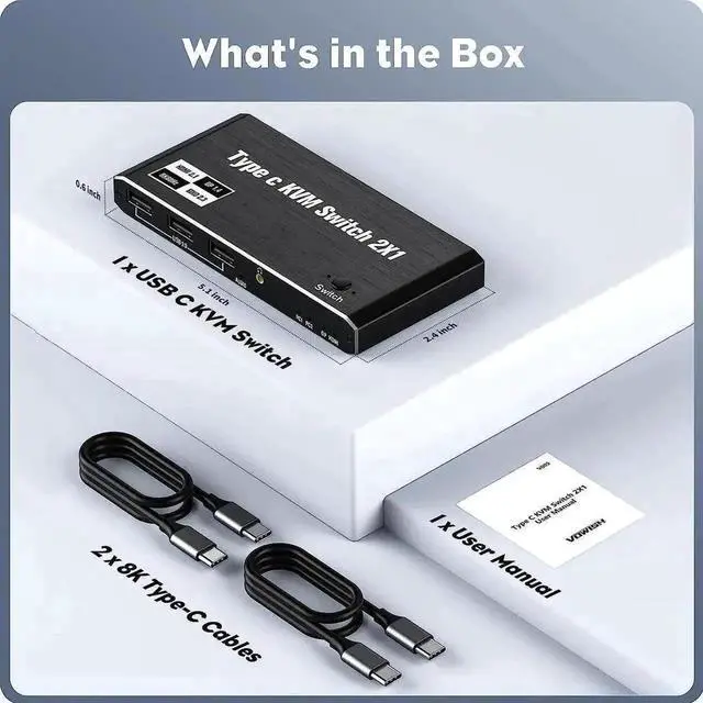USB C KVM Switch 8K@60Hz 4K@120Hz, 2 Port Type C KVM Switch for 2 Computers Share 1 Monitor, USB C KCM with 3 USB 2.0 Ports & 100W Power Delivery, 2 USB-C Cables Included