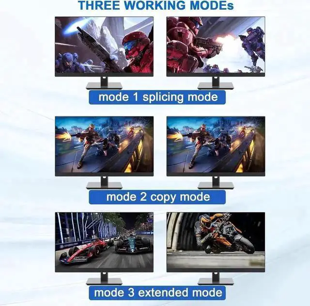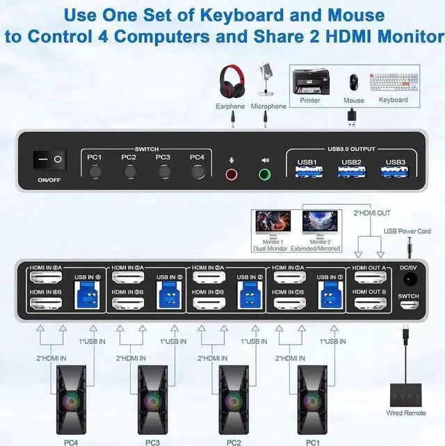 4 computers/laptops share one set of keyboard, mouse and dual monitors, USB 3.0 ports, microphone and audio port;