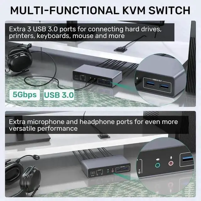 • Audio and Microphone Interface & USB A Port: This HDMI KVM switch has audio and microphone ports and has 3 extra USB A ports. It also supports the connection of USB A devices such as mouse, keyboard, printer, and more. You only need to use one set of mouse and keyboard to control 2 computers.USB 3.0 transfer speed is up to 5Gbps.