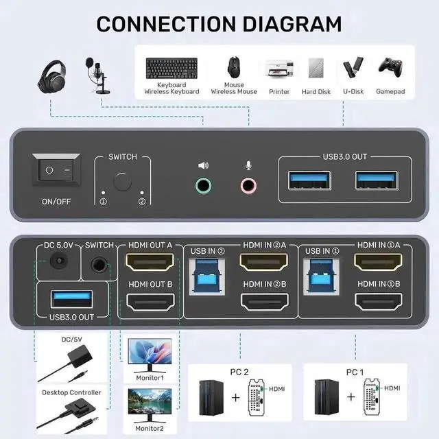 This HDMI monitor switch for 2 computers has audio and microphone ports and has 3 extra USB A ports. It also supports the connection of USB A devices such as mouse, keyboard, printer, hard disk, and more. You only need to use one set of mouse and keyboard to control 2 computers. USB 3.0 transfer speed is up to 5Gbps.