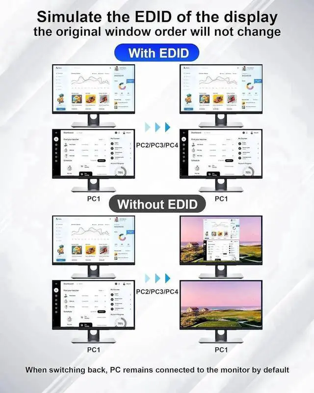 This kvm switch dual monitor 4 port help you control 4 PCs share 2 monitors by only one set of USB keyboard & mouse.