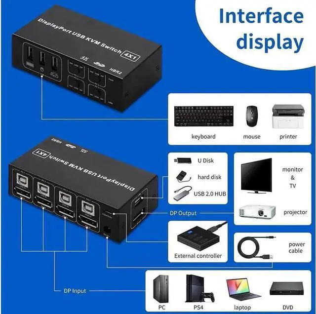 • [4 Port DisplayPort KVM Switch]- The kvm switcher can help you control 4 signal sources with just one Monitor, Mouse, Keyboard