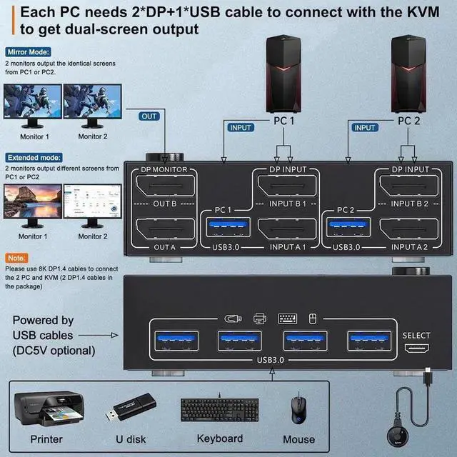 Displayport Dual Monitor KVM Switch, 2 computers share 2 monitors and 4 USB 3.0 devices.