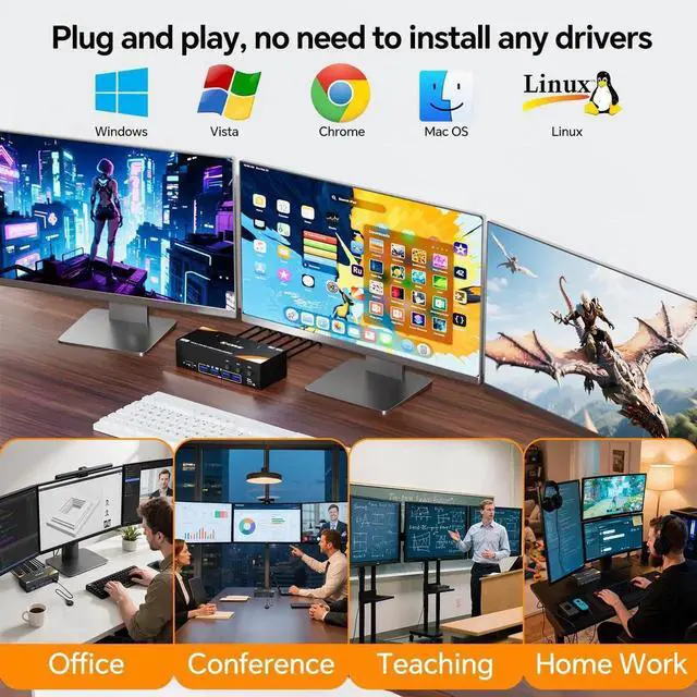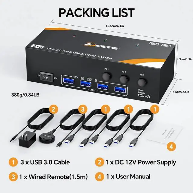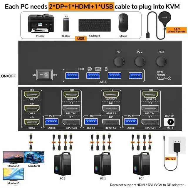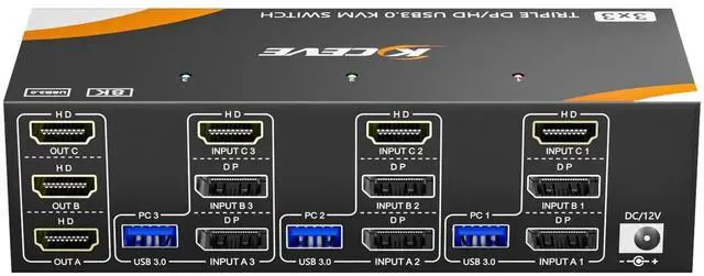 HDMI + DP + DP KVM Switch for 3 Computers 3 Monitors Share 4 USB 3.0 Devices