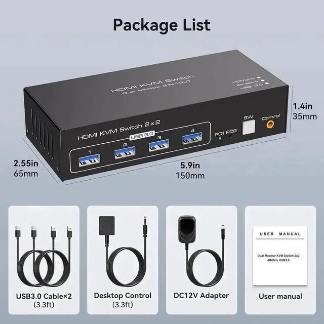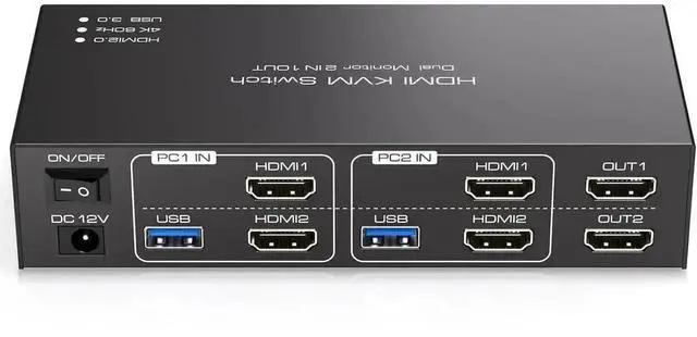 The KVM Switch 2 Monitors has four USB 3.0 ports with a data transfer rate up to 5Gbp/s, which is 10 times faster than USB 2.0 ports. USB 2.0 devices are compatible. The KVM Switcher can be used to share USB devices such as wired or wireless keyboards and mice, printers, scanners, webcams. The 12V/1A external power supply can drive high-power USB devices to steady state ( <10W). Compatible with Windows/Vista/XP and Mac OS, Linux and Unix