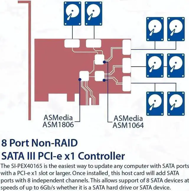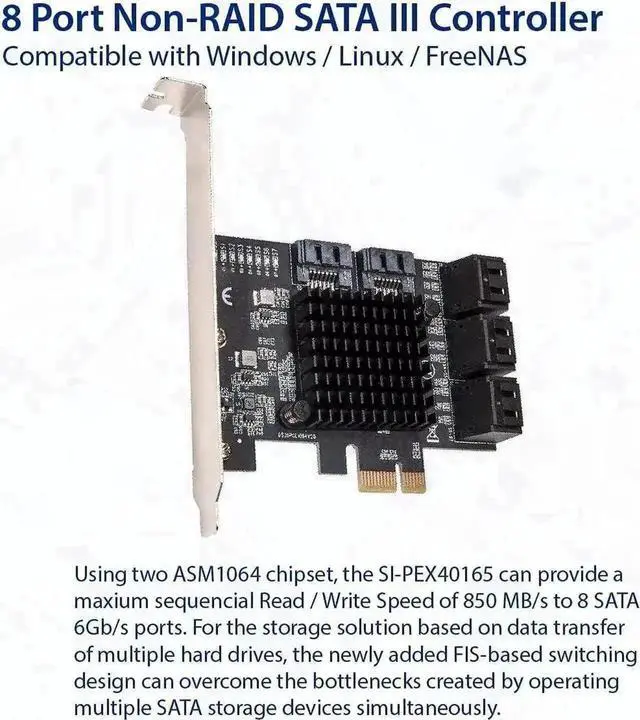 PCIe Gen3 x1 interface to 8 ports NONE-RAID SATA III 6Gbps card will allow users add 8 x SATA III ports on desktop PCs, Servers, and NAS systems for storage expansions or AHCI boot use.