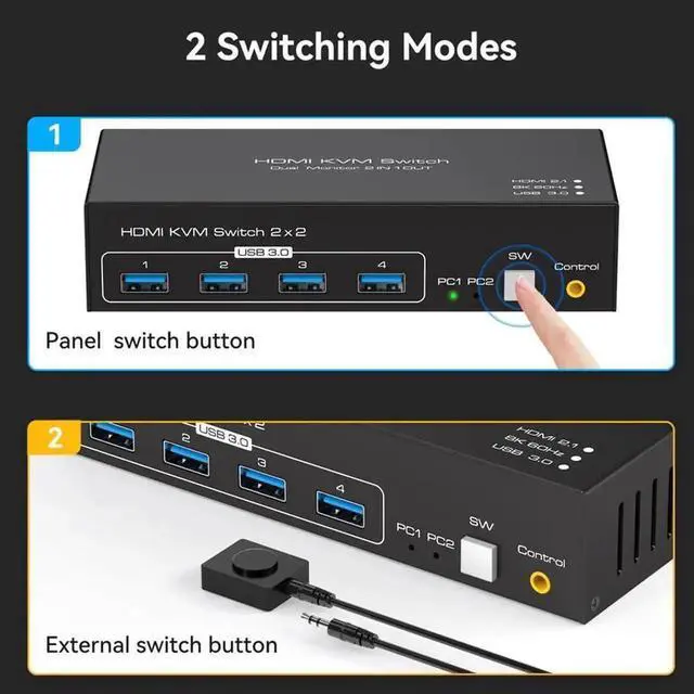 Support front panel buttons and External switch button to control KVM to switch inputs.