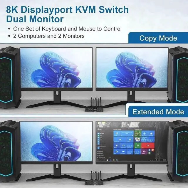 8K DP 1.4 Dual Monitor KVM Switch DisplayPort 2 computers share 2 monitor