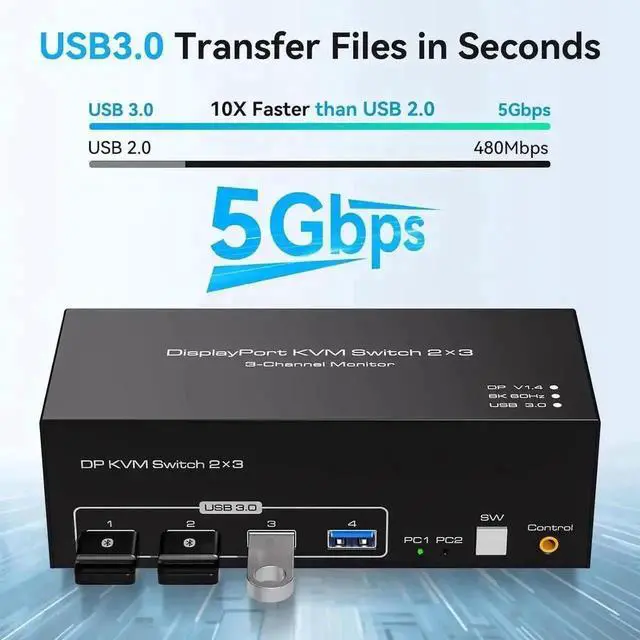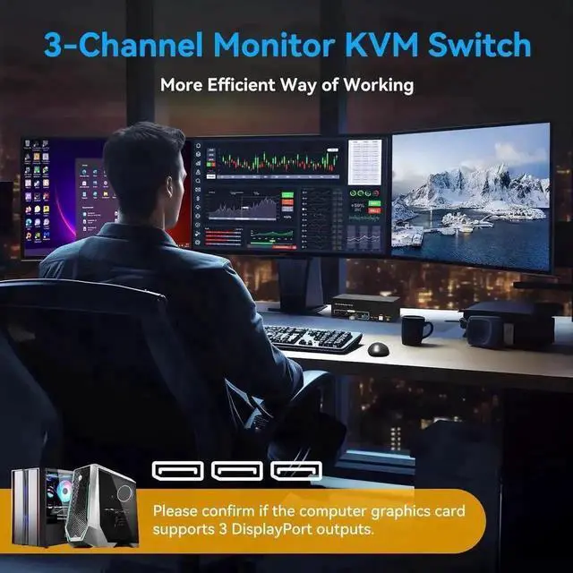 Monitor KVM Switch: This 3 monitor kvm perfect for hooking up 2 desktops or laptops to share one set of keyboard, mouse and 3 monitors for extended, mirror display; Perfect for computers with 3 DP monitor for the display outputs. It requires every Laptop/PC support 3 screen or above display functions and must support extended display.