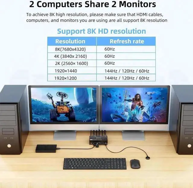 kvm switch 2 monitors 2 computers Support 8K@60Hz, 4K@120Hz and downward compatible with other resolution. Adaptive to different resolutions of different devices without manual setting.