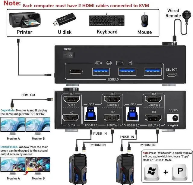 Dual monitor kvm switch Each computer needs 2 * HDMI cable+1 * USB 3.0 cable to connect KVM.