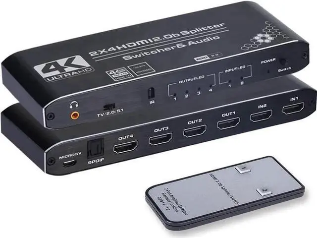 Switch Splitter 2x4 with Audio Extractor, 4Kx2k @60Hz Ultra HD HDMI Switcher with Optical TOSLINK SPDIF, 3.5mm Audio Support HDCP 2.2, HDMI2.0b, 4K@60HZ, RGB4:4:4, 4K HDR HDTV (Remote Control)