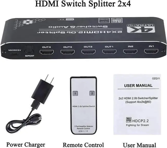 - 2 HDMI inputs switch and split to 4 HDMI displays