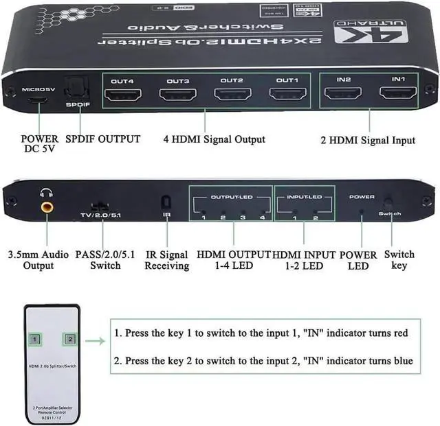 • 2 In 4 Out HDMI Splitter Switcher- HDMI switch could connect 2 HDMI sources to 4 HDMI displays to meet the needs of multiple devices you use at the same time. Come with IR Remote Control for switching the signal freely, also press 'switch button' at device can choose the input channel that you want.