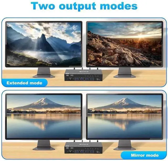 This 2 monitors KVM switch allows you to effortlessly manage 3 computers to share 2 monitors and 4 USB devices together. You can choose expanded mode and copy mode between two monitors as required, the extended mode can output two different screens and the mirror mode can output two identical screens.