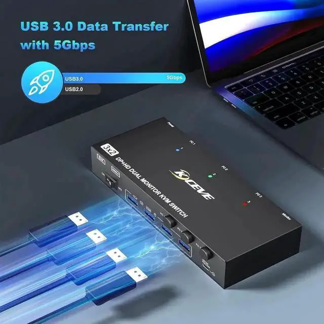 USB 3.0 KVM switch 3 computers 2 monitors transfer files in Seconds. This dual display KVM Switch supports ultra-fast USB 3.0 data transfer rates of up to 5Gb/s. With 4 USB 3.0 ports for peripheral USB devices such as keyboard, mouse, printer, etc., backward compatible with USB 2.0 / 1.1. Support wireless keyboard and mouse.
