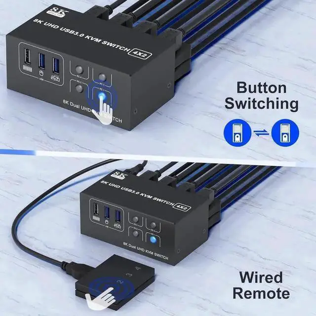 Latest version of KVM - More Compact 8K HDMI Dual Monitor KVM Switch 4 computers share 2 monitor and 4 USB devices
