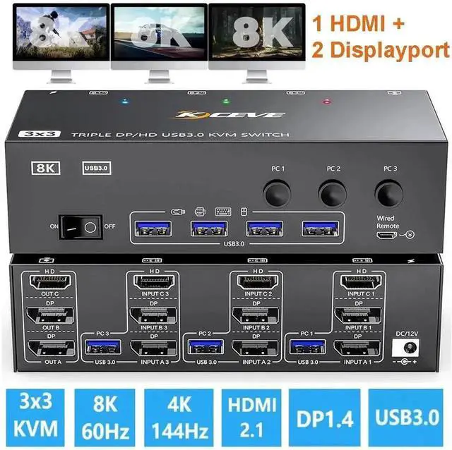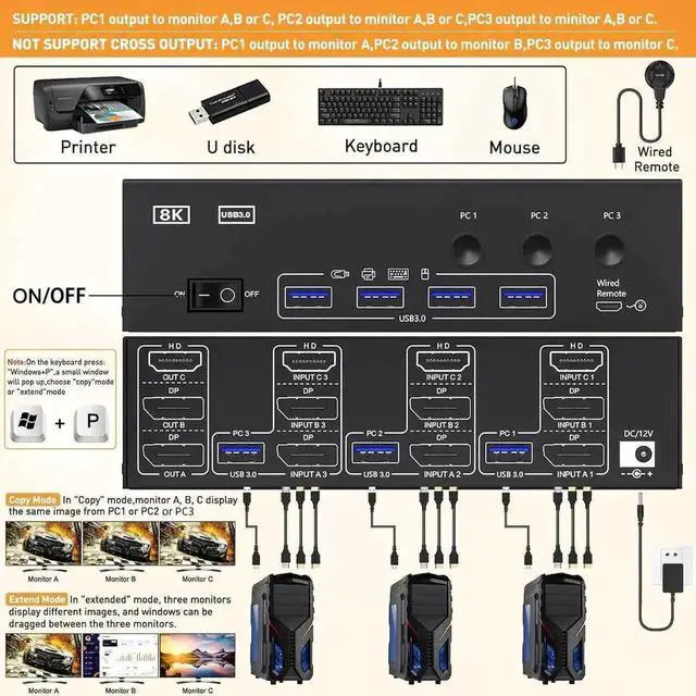 This 3 computers 3 monitors KVM switch perfect for hooking up 3 desktops /laptops to share one set of wired or wireless keyboard mouse and 3 monitors (supports extended and mirrored display modes).