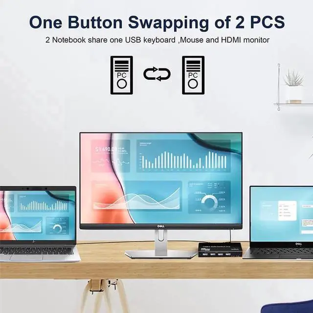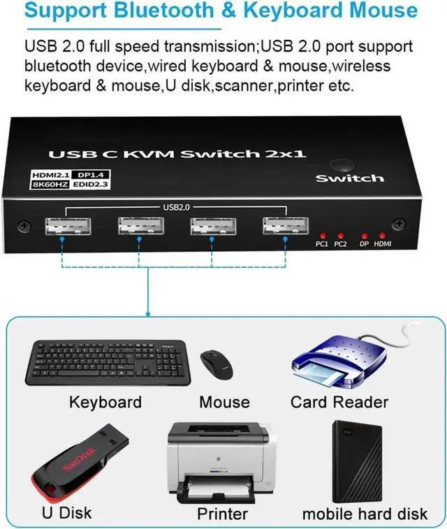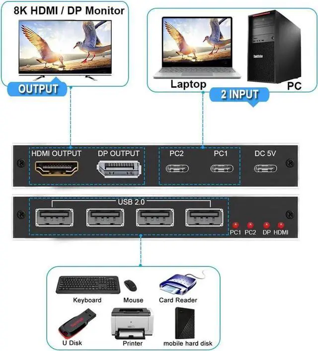 2xUSB-C 8K KVM Switch with one DisplayPort 1.4 or HDMI 2.1 Port for Video, with this 2 Port 8K KVM Switcher, you are able to connect from the switcher's two PC Input Port to your USB-C PC/Laptops via two standard USB-C Gen-2 Cable, then connect from the switcher's Standard DP 1.4 /HDMI 2.1 port to your Monitors via your own displayport 8K Standard Cable, you can press the "Switch"button to switch between two of your PCs.