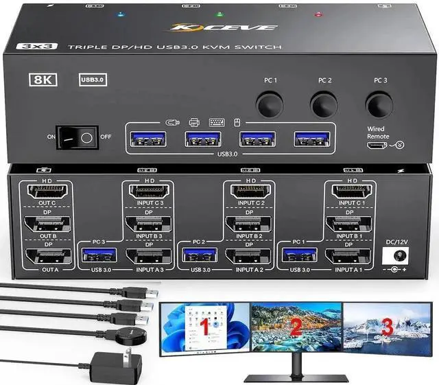 8K Triple Monitor KVM Switch 3 Computers Share 3 Monitors & 4 USB 3.0 Device