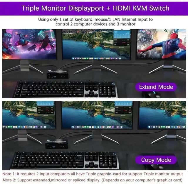 1, Share one set of keyboard, mouse and 3 monitors (DP+ DP+HDMI) between 2 computers or laptops;