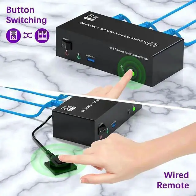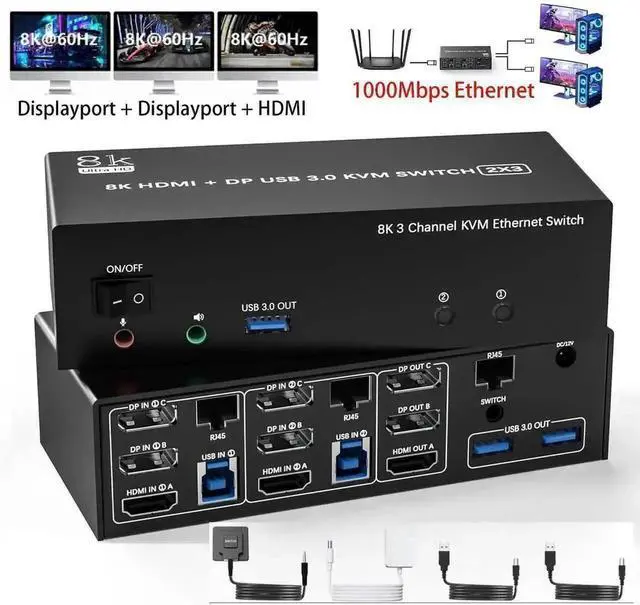 1x 2Ports 8K@60Hz USB 3.0 HDMI + 2 DisplayPort Triple Monitor KVM Switch, 2x USB 3.0 Cables, 1x Power Adapter, 1x Wired Button Switch, 1x User's manual.
