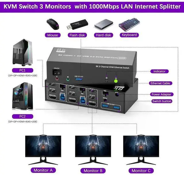 This kvm switch triple monitor 2 port help you control 2 PCs share 3 monitors by only one set of USB keyboard & mouse and share 1000Mbps gigabit ethernet between 2 computers.
