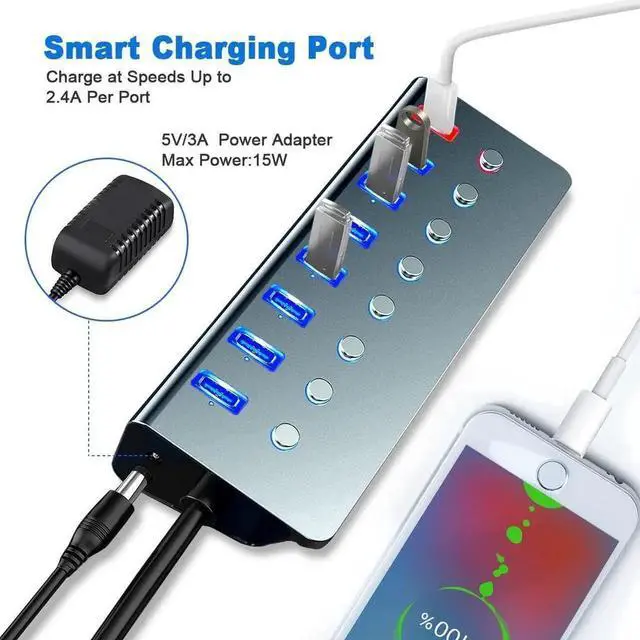Smart charging port: Powered USB Hub provides an independent charging port to support the charging function. In addition, we are equipped with a 5V/3A power adapter, which can provide up to 2.4A charging power, which can be better for iphone, ipad, and other electronics Product power supply.