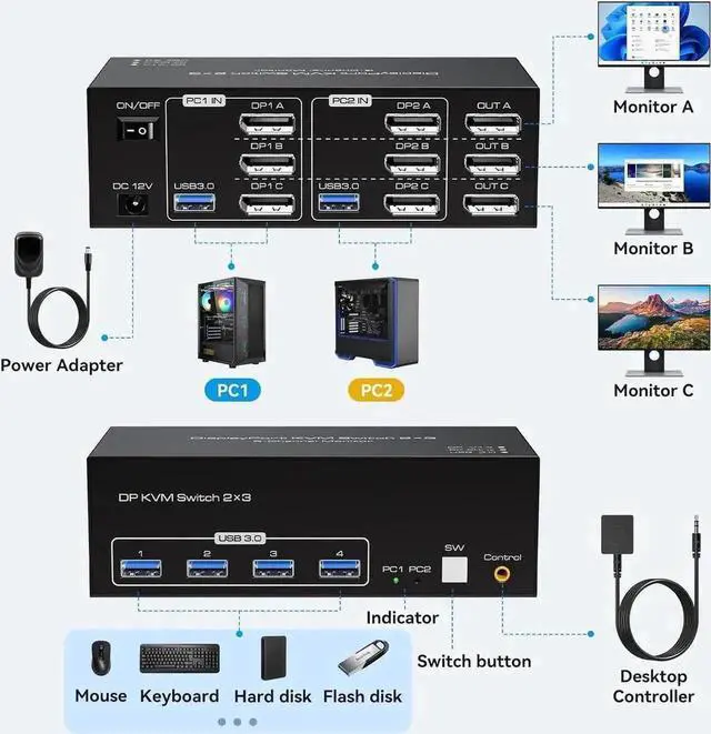 KVM Switch 3 Monitors 2 Computers8K Displayport KVM Switch for 2 Computers Share 3 Monitors and 4 USB 3.0 devices.