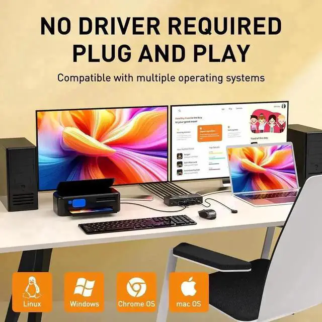 Application This Displayport KVM switch dual monitor help you to control 3 computers or laptops by only one set of wired or wireless keyboard mouse, share 2 monitors and 4 USB 3.0 devices